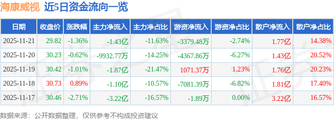 证券之星消息,截至2025年11月21日收盘,海康威视(002415)报收于29.82元,下跌1.36%,换手率0.45%,成交量41.09万手,成交额12.32亿元。