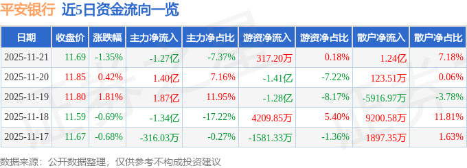 证券之星消息,截至2025年11月21日收盘,平安银行(000001)报收于11.69元,下跌1.35%,换手率0.76%,成交量146.54万手,成交额17.22亿元。