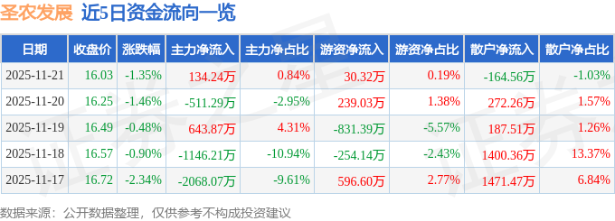 证券之星消息,截至2025年11月21日收盘,圣农发展(002299)报收于16.03元,下跌1.35%,换手率0.81%,成交量9.93万手,成交额1.6亿元。