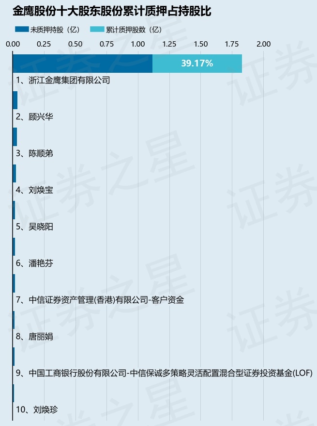 截止本公告日,股东浙江金鹰集团有限公司已累计质押股份7179.46万股,占其持股总数的39.17%。本次质押后金鹰股份十大股东的累计质押股份占持股比例(占持股比例的计算以公司最新一期财务报表公布的十大股东的持股总数为基准)见下图: