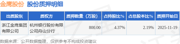 证券之星消息,金鹰股份(600232)11月22日公开信息显示,股东浙江金鹰集团有限公司向杭州银行股份有限公司舟山分行合计质押800.0万股,占总股本2.19%。质押详情见下表: