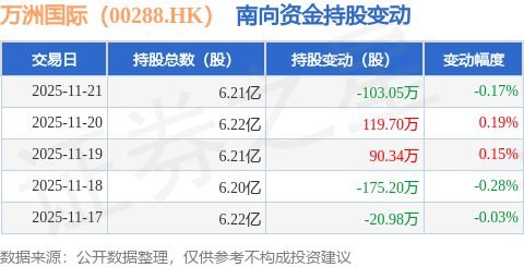 证券之星消息,11月21日南向资金减持103.05万股万洲国际(00288.HK)。近5个交易日中,获南向资金减持的有3天,累计净减持89.19万股。近20个交易日中,获南向资金增持的有16天,累计净增持5851.69万股。截至目前,南向资金持有万洲国际(00288.HK)6.21亿股,占公司已发行普通股的4.83%。