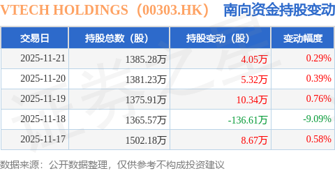 证券之星消息,11月21日南向资金增持4.05万股VTECH HOLDINGS(00303.HK)。近5个交易日中,获南向资金减持的有1天,累计净减持108.23万股。近20个交易日中,获南向资金增持的有17天,累计净增持17.95万股。截至目前,南向资金持有VTECH HOLDINGS(00303.HK)1385.28万股,占公司已发行普通股的5.47%。