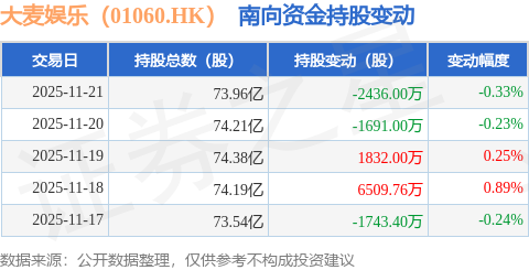 证券之星消息,11月21日南向资金减持2436.0万股大麦娱乐(01060.HK)。近5个交易日中,获南向资金增持的有2天,累计净增持2471.36万股。近20个交易日中,获南向资金减持的有11天,累计净减持8408.11万股。截至目前,南向资金持有大麦娱乐(01060.HK)73.96亿股,占公司已发行普通股的24.75%。