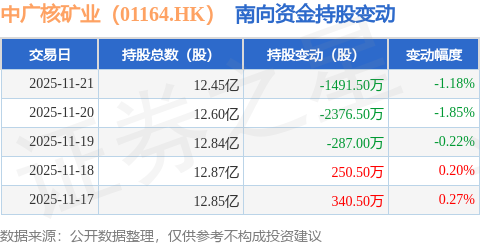 证券之星消息,11月21日南向资金减持1491.5万股中广核矿业(01164.HK)。近5个交易日中,获南向资金减持的有3天,累计净减持3564.0万股。近20个交易日中,获南向资金增持的有13天,累计净增持445.0万股。截至目前,南向资金持有中广核矿业(01164.HK)12.45亿股,占公司已发行普通股的16.37%。