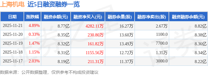 上海机电融资融券信息显示,融资方面,当日融资买入1.36亿元,融资偿还9344.08万元,融资净买入4282.11万元,连续3日净买入累计4674.73万元。融券方面,融券卖出2.72万股,融券偿还500.0股,融券余量16.27万股,融券余额460.28万元。融资融券余额8.82亿元。