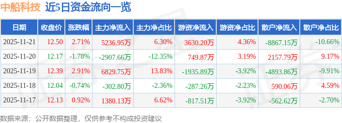 证券之星消息,截至2025年11月21日收盘,中船科技(600072)报收于12.5元,上涨2.71%,换手率6.15%,成交量66.65万手,成交额8.32亿元。