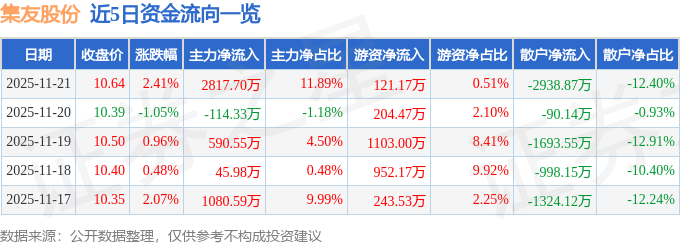 证券之星消息,截至2025年11月21日收盘,集友股份(603429)报收于10.64元,上涨2.41%,换手率4.26%,成交量22.34万手,成交额2.37亿元。