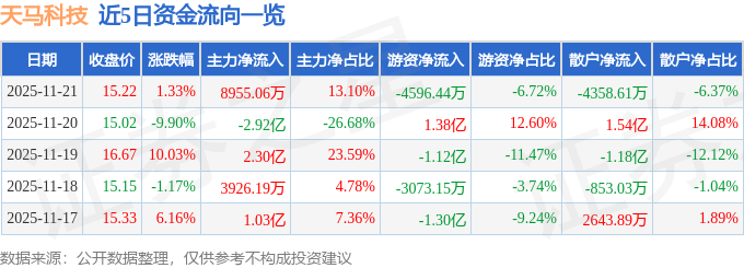 证券之星消息,截至2025年11月21日收盘,天马科技(603668)报收于15.22元,上涨1.33%,换手率9.09%,成交量45.79万手,成交额6.84亿元。