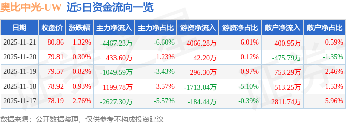 证券之星消息,截至2025年11月21日收盘,奥比中光(688322)报收于80.86元,上涨1.32%,换手率2.89%,成交量8.45万手,成交额6.77亿元。