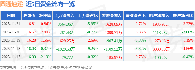 证券之星消息,截至2025年11月21日收盘,圆通速递(600233)报收于16.81元,上涨0.84%,换手率1.04%,成交量35.76万手,成交额5.99亿元。