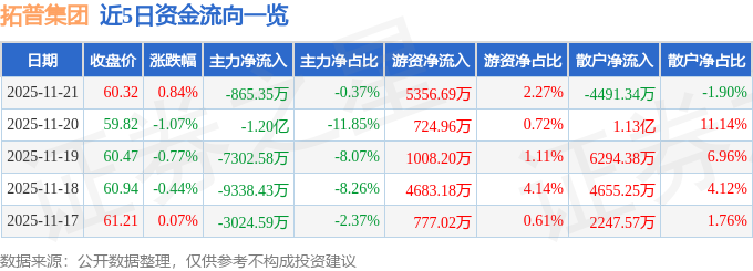 证券之星消息,截至2025年11月21日收盘,拓普集团(601689)报收于60.32元,上涨0.84%,换手率2.25%,成交量39.15万手,成交额23.62亿元。
