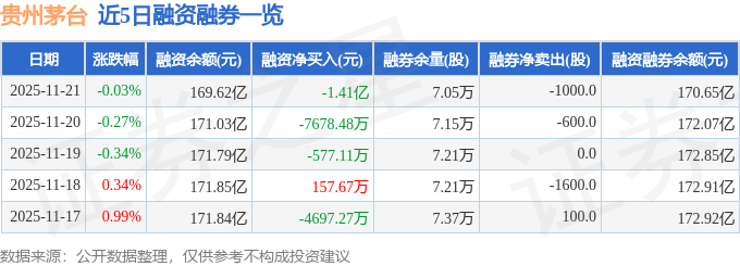 贵州茅台融资融券信息显示,融资方面,当日融资买入3.32亿元,融资偿还4.72亿元,融资净偿还1.41亿元。融券方面,融券卖出4300.0股,融券偿还5300.0股,融券余量7.05万股,融券余额1.03亿元。融资融券余额170.65亿元。