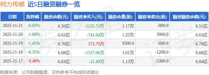 柯力传感融资融券信息显示,融资方面,当日融资买入2501.99万元,融资偿还3727.72万元,融资净偿还1225.73万元。融券方面,融券卖出4300.0股,融券偿还5100.0股,融券余量1.17万股,融券余额70.57万元。融资融券余额6.51亿元。