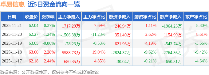 证券之星消息,截至2025年11月21日收盘,卓易信息(688258)报收于62.04元,下跌0.37%,换手率2.93%,成交量3.55万手,成交额2.23亿元。