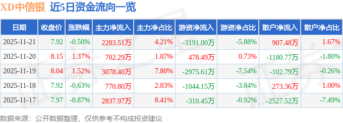 证券之星消息,截至2025年11月21日收盘,XD中信银(601998)报收于7.92元,下跌0.5%,换手率0.17%,成交量68.07万手,成交额5.42亿元。
