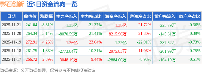 证券之星消息,截至2025年11月21日收盘,影石创新(688775)报收于241.04元,下跌8.81%,换手率8.4%,成交量2.56万手,成交额6.33亿元。