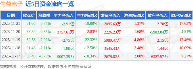 证券之星消息,截至2025年11月21日收盘,生益电子(688183)报收于81.06元,下跌8.74%,换手率2.22%,成交量18.47万手,成交额15.29亿元。