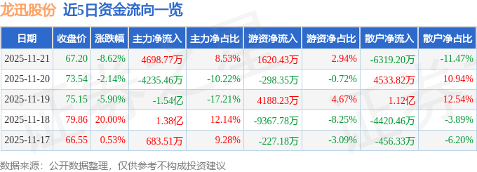 证券之星消息,截至2025年11月21日收盘,龙迅股份(688486)报收于67.2元,下跌8.62%,换手率10.76%,成交量8.0万手,成交额5.51亿元。