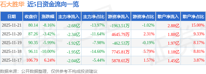 证券之星消息,截至2025年11月21日收盘,石大胜华(603026)报收于80.14元,下跌8.16%,换手率11.45%,成交量23.2万手,成交额19.19亿元。