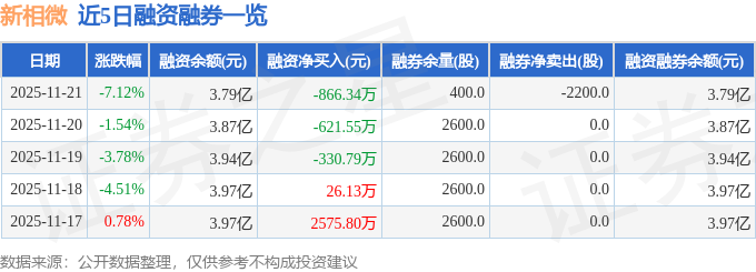 新相微融资融券信息显示,融资方面,当日融资买入1664.83万元,融资偿还2531.17万元,融资净偿还866.34万元。融券方面,融券卖出0.0股,融券偿还2200.0股,融券余量400.0股,融券余额0.78万元。融资融券余额3.79亿元。