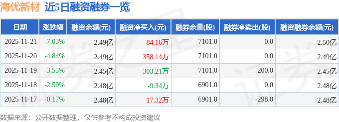 证券之星消息,截至2025年11月21日收盘,海优新材(688680)报收于38.23元,下跌7.03%,换手率3.37%,成交量2.83万手,成交额1.1亿元。