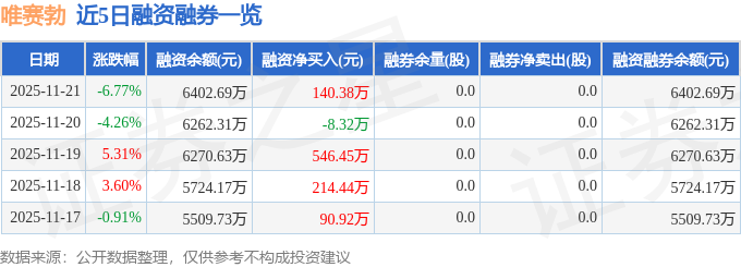 唯赛勃融资融券信息显示,融资方面,当日融资买入1313.85万元,融资偿还1173.46万元,融资净买入140.38万元。融券方面,融券卖出0.0股,融券偿还0.0股,融券余量0.0股,融券余额0.0万元。融资融券余额6402.69万元。
