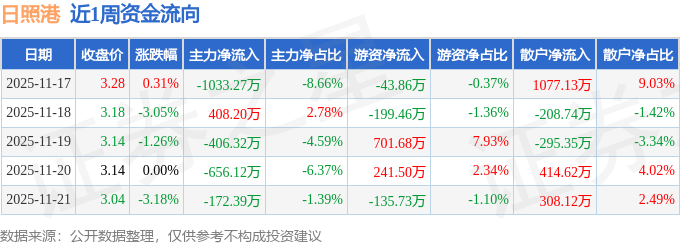 资金流向数据方面,本周日照港主力资金合计净流出1859.89万元,游资资金合计净流入564.12万元,散户资金合计净流入1295.77万元。本周资金流向一览见下表: