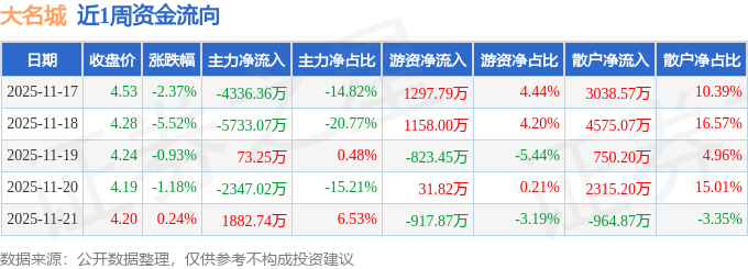 资金流向数据方面,本周大名城主力资金合计净流出1.05亿元,游资资金合计净流入746.28万元,散户资金合计净流入9714.18万元。本周资金流向一览见下表: