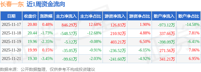 资金流向数据方面,本周长春一东主力资金合计净流入157.95万元,游资资金合计净流入262.83万元,散户资金合计净流出420.78万元。本周资金流向一览见下表: