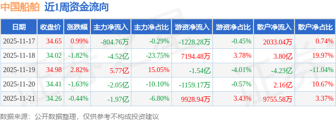 资金流向数据方面,本周中国船舶主力资金合计净流出2.85亿元,游资资金合计净流出629.42万元,散户资金合计净流入2.91亿元。本周资金流向一览见下表: