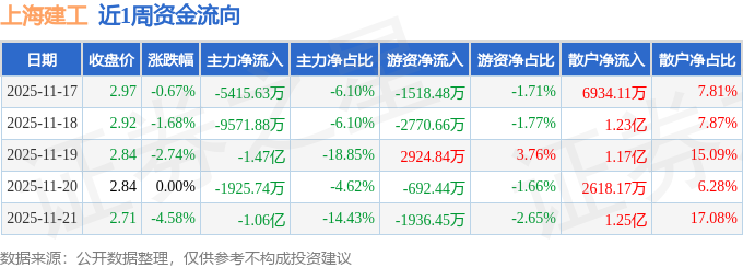 资金流向数据方面,本周上海建工主力资金合计净流出4.21亿元,游资资金合计净流出3993.18万元,散户资金合计净流入4.61亿元。本周资金流向一览见下表: