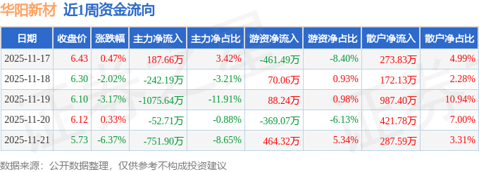 资金流向数据方面,本周华阳新材主力资金合计净流出1934.79万元,游资资金合计净流出207.95万元,散户资金合计净流入2142.74万元。本周资金流向一览见下表: