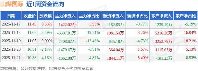沪深股通持股方面,截止2025年11月21日收盘,山煤国际沪股通持股数为3418.96万股,占流通股比为172.0%。