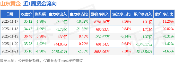 资金流向数据方面,本周山东黄金主力资金合计净流出2.79亿元,游资资金合计净流入1.79亿元,散户资金合计净流入1.0亿元。本周资金流向一览见下表: