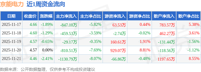 资金流向数据方面,本周京能电力主力资金合计净流出3277.09万元,游资资金合计净流入1083.61万元,散户资金合计净流入2193.49万元。本周资金流向一览见下表:
