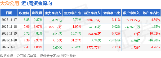资金流向数据方面,本周大众公用主力资金合计净流入3.44亿元,游资资金合计净流出2.28亿元,散户资金合计净流出1.16亿元。本周资金流向一览见下表: