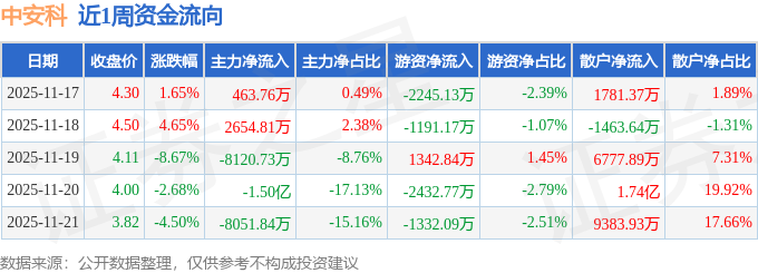 资金流向数据方面,本周中安科主力资金合计净流出2.8亿元,游资资金合计净流出5858.32万元,散户资金合计净流入3.39亿元。本周资金流向一览见下表: