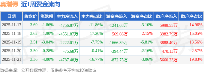 资金流向数据方面,本周奥瑞德主力资金合计净流出1.64亿元,游资资金合计净流出3606.19万元,散户资金合计净流入2.0亿元。本周资金流向一览见下表:
