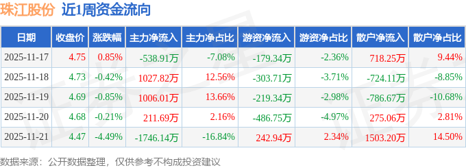 资金流向数据方面,本周珠江股份主力资金合计净流出39.52万元,游资资金合计净流出946.21万元,散户资金合计净流入985.73万元。本周资金流向一览见下表: