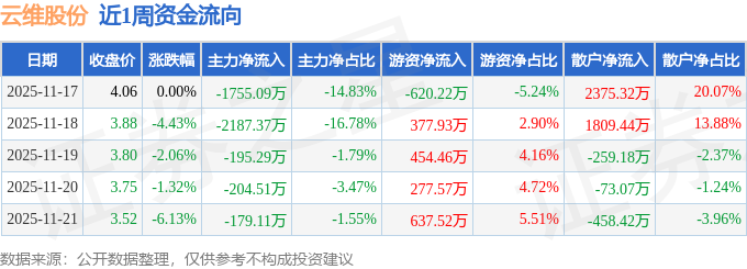 资金流向数据方面,本周云维股份主力资金合计净流出4521.36万元,游资资金合计净流入1127.27万元,散户资金合计净流入3394.09万元。本周资金流向一览见下表: