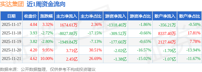 资金流向数据方面,本周实达集团主力资金合计净流入5.33亿元,游资资金合计净流出3.57亿元,散户资金合计净流出1.76亿元。本周资金流向一览见下表: