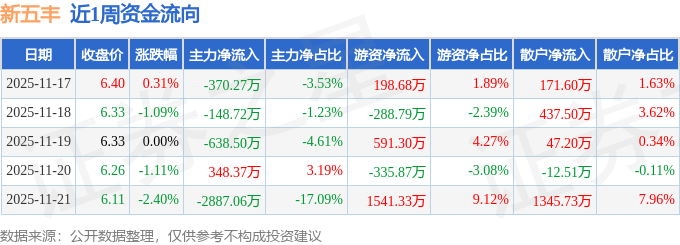 资金流向数据方面,本周新五丰主力资金合计净流出3696.17万元,游资资金合计净流入1706.66万元,散户资金合计净流入1989.52万元。本周资金流向一览见下表: