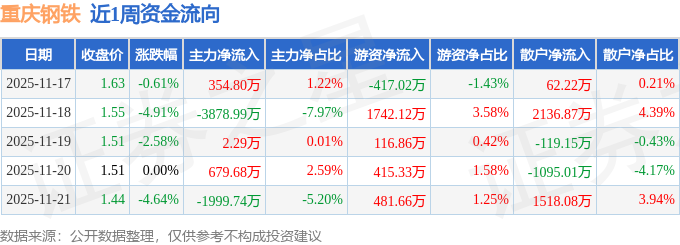 资金流向数据方面,本周重庆钢铁主力资金合计净流出4841.97万元,游资资金合计净流入2338.95万元,散户资金合计净流入2503.01万元。本周资金流向一览见下表:
