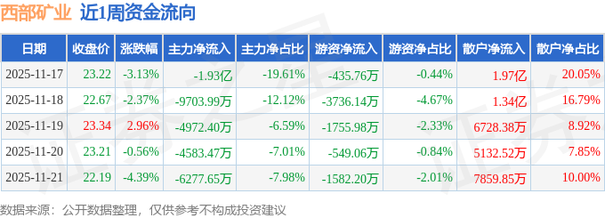 资金流向数据方面,本周西部矿业主力资金合计净流出4.48亿元,游资资金合计净流出8059.14万元,散户资金合计净流入5.29亿元。本周资金流向一览见下表: