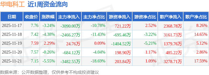 资金流向数据方面,本周华电科工主力资金合计净流出9698.19万元,游资资金合计净流出976.01万元,散户资金合计净流入1.07亿元。本周资金流向一览见下表: