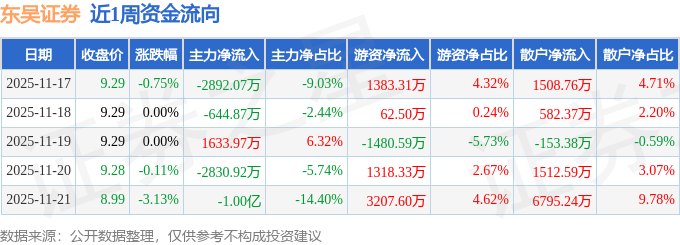资金流向数据方面,本周东吴证券主力资金合计净流出1.47亿元,游资资金合计净流入4491.15万元,散户资金合计净流入1.02亿元。本周资金流向一览见下表: