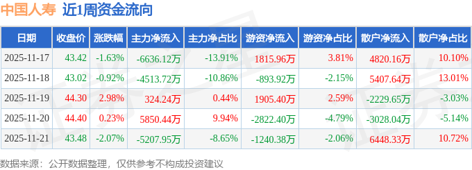 资金流向数据方面,本周中国人寿主力资金合计净流出1.02亿元,游资资金合计净流出1235.33万元,散户资金合计净流入1.14亿元。本周资金流向一览见下表: