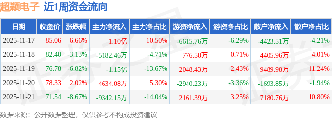资金流向数据方面,本周超颖电子主力资金合计净流出1.04亿元,游资资金合计净流出4569.68万元,散户资金合计净流入1.5亿元。本周资金流向一览见下表: