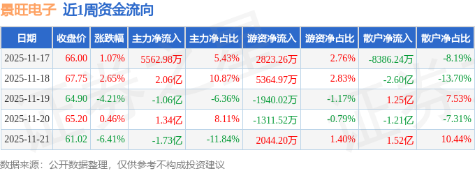 资金流向数据方面,本周景旺电子主力资金合计净流入1.18亿元,游资资金合计净流入6980.89万元,散户资金合计净流出1.87亿元。本周资金流向一览见下表: